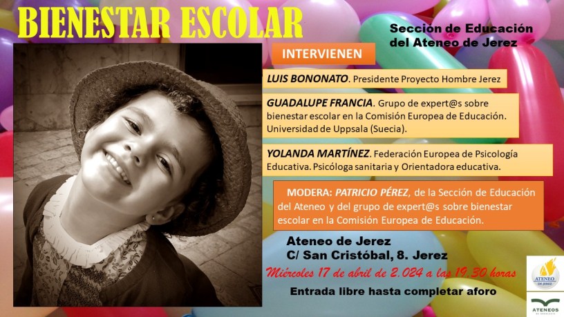 El Ateneo de Jerez llevará a cabo el próximo miércoles 17 de abril una mesa redonda sobre el bienestar escolar. El debate comenzará a las 19:30 horas en la sede de esta asociación, sito en calle San Cristóbal, 8, de Jerez. La entrada es libre hasta completar aforo. Esta mesa redonda, dentro de las actuaciones que desarrolla la Sección de Educación del Ateneo de Jerez, con la participación de estos tres expertos nacionales e internacionales, pretende generar un debate sobre el papel del bienestar en la integración e inclusión social de la población infantil y juvenil.
