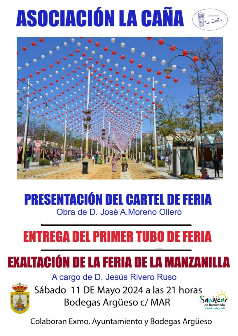 Este fin de semana se celebrarán diversos actos para anunciar la proximidad de la fiesta sanluqueña en honor de su exclusivo vino, la Manzanilla. La asociación de caseteros ‘La Caña’ tiene previsto celebrar mañana sábado su tradicional Exaltación de la Feria de la Manzanilla a cargo de Jesús Rivero Ruso, que incluirá además la presentación del cartel de la Feria, obra de José A. Moreno Ollero y la entrega simbólica del primer tubo de la feria, un acto que se celebrará este sábado 11 de mayo a las 21 horas en las Bodegas Argüeso de la calle Mar.