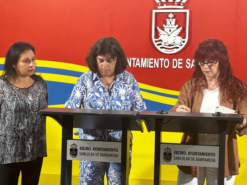 La alcaldesa, Carmen Álvarez, acompañada por la delegada municipal de Servicios Sociales, Nuria Prado, ha firmado hoy el convenio de colaboración anual del Ayuntamiento de Sanlúcar con la Asociación de Personas con Depresión o Ansiedad ‘Bello Amanecer’, representada por su presidenta, Caridad Cañas.